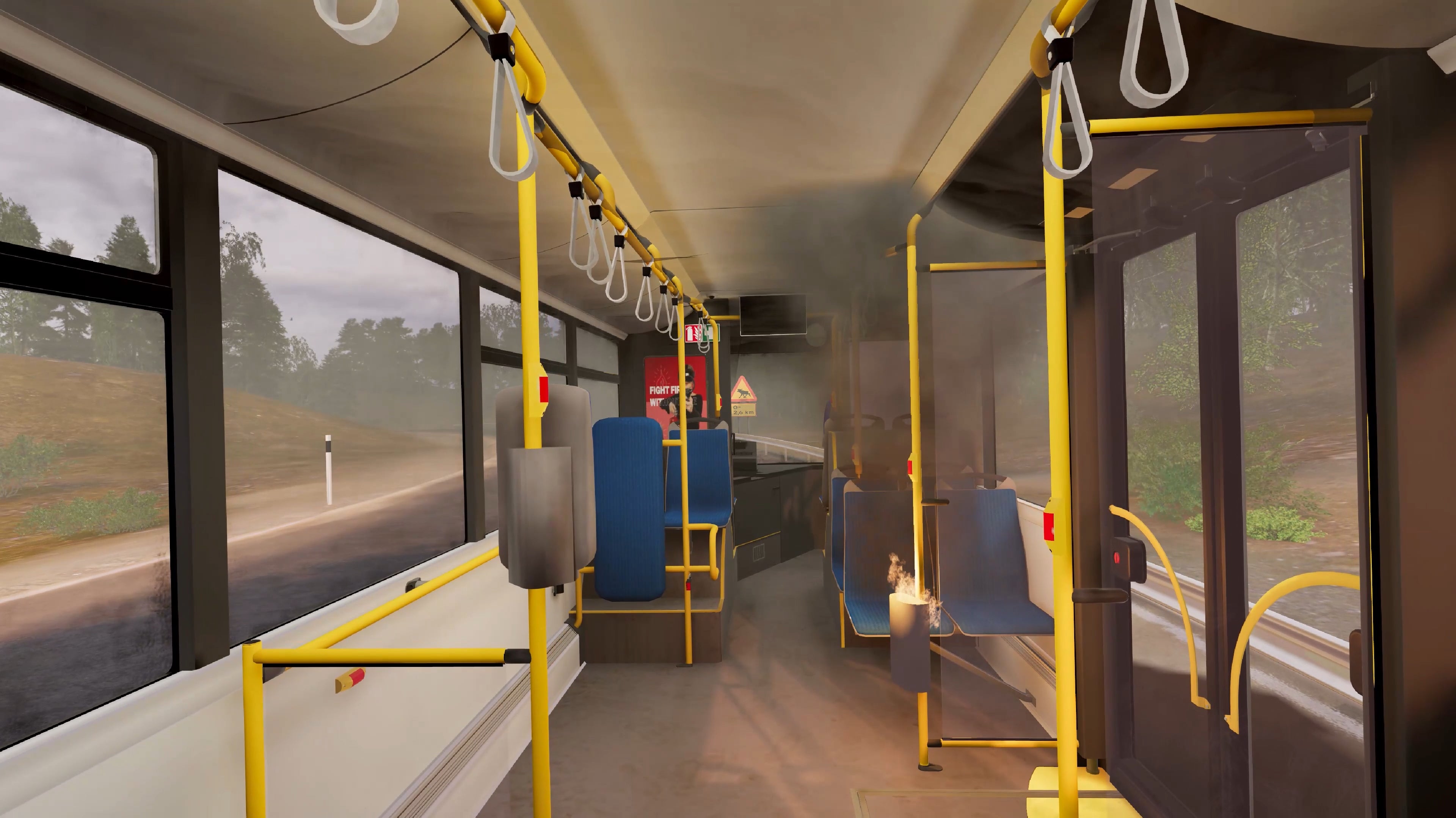 The fire occurs in a means of transportation, and one of the passengers or the driver intervenes with the fire extinguisher provided on the bus.